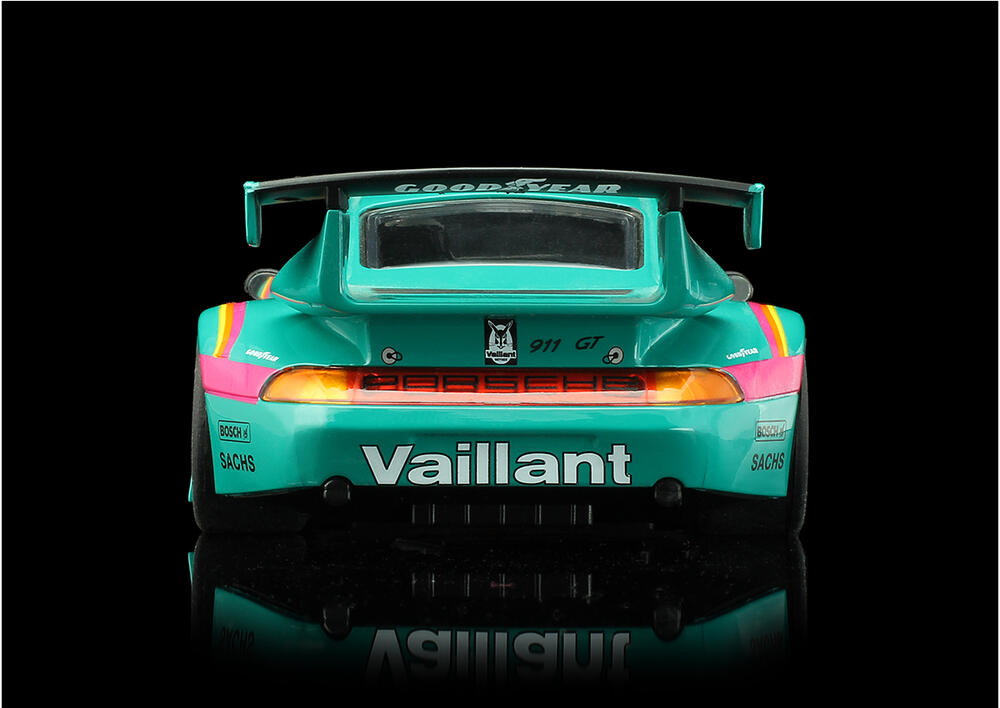 Carro de corrida verde e rosa visto de trás com texto Vaillant e asa traseira
