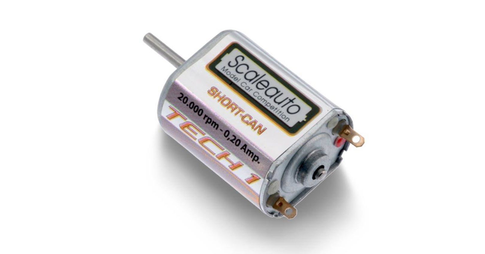 Motor elétrico prateado com etiqueta Scaleauto e texto técnico, eixo metálico sobre fundo branco
