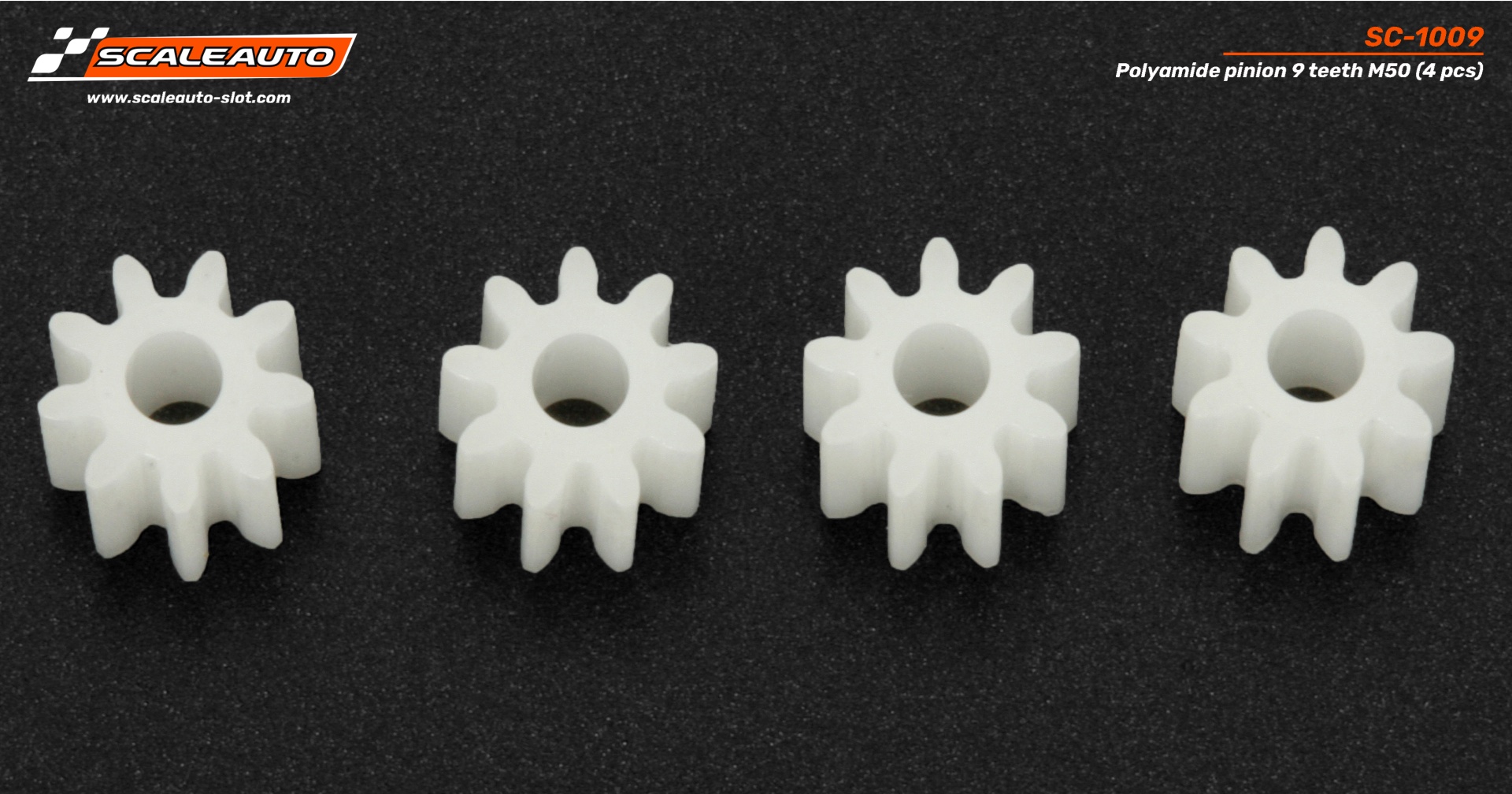 Quatro pinhões plásticos brancos com 9 dentes cada sobre fundo preto