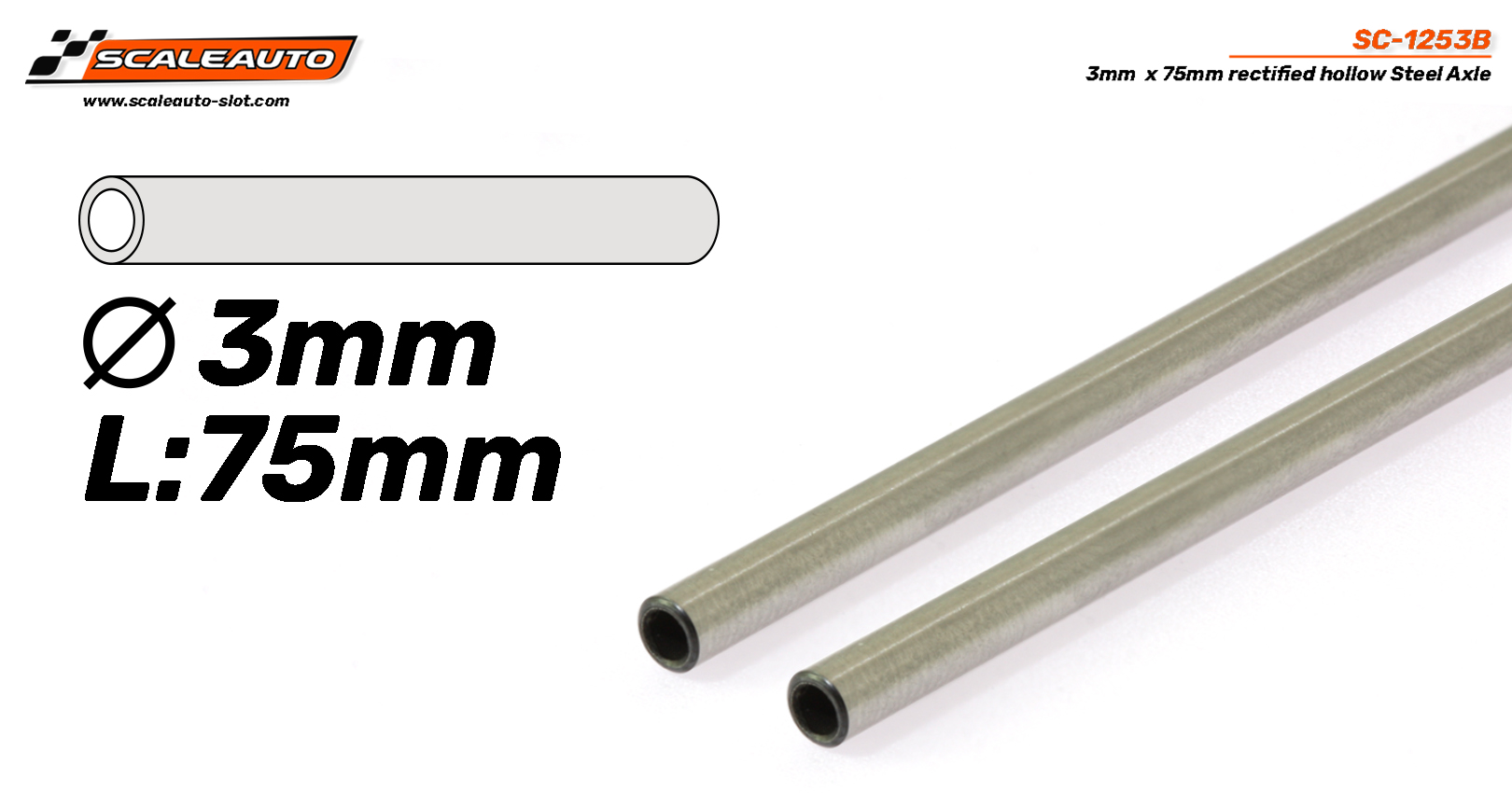 Dois eixos cilíndricos prateados de aço oco de 3mm de diâmetro e 75mm de comprimento com texto e logotipos da marca Scaleauto