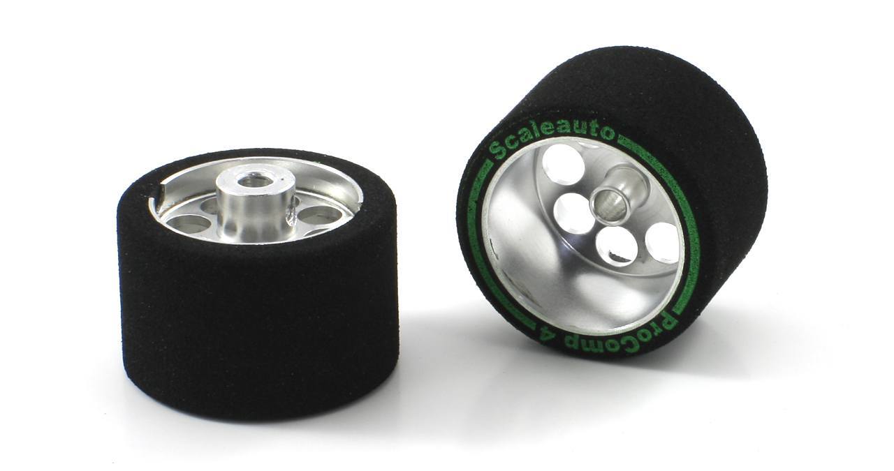 Dois pneus de espuma preta com aros de alumínio prateados e texto verde