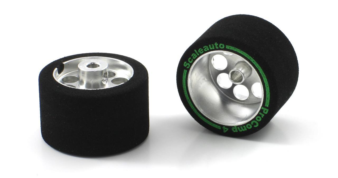 Pneus de slot com rodas metálicas e pneus de espuma preta com texto verde e amarelo.