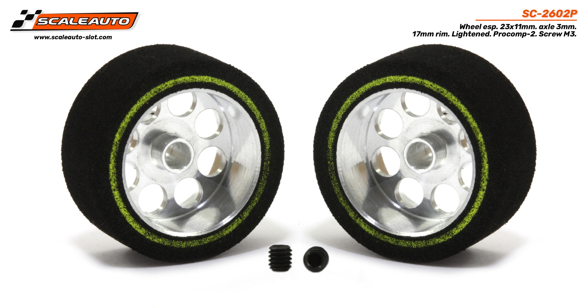 Rueda esp. 23x11mm. eje 3mm. llanta 17mm. Aligerada.  Procomp-2. Tornillo M3.