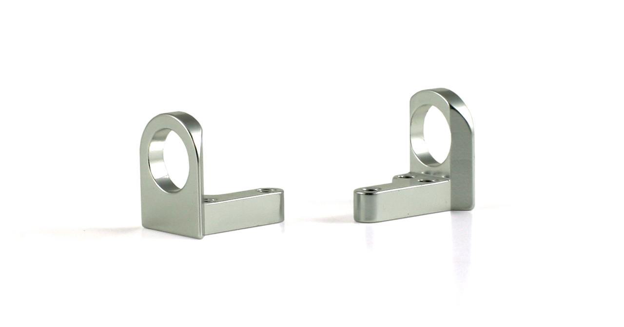 Par de suportes metálicos cinza prateados com anéis circulares.