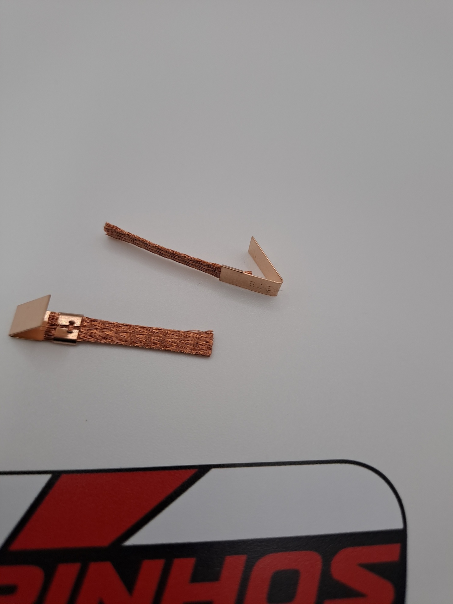Dois cabos de cobre com extremidades dobradas sobre superfície branca com parte de logótipo visível.