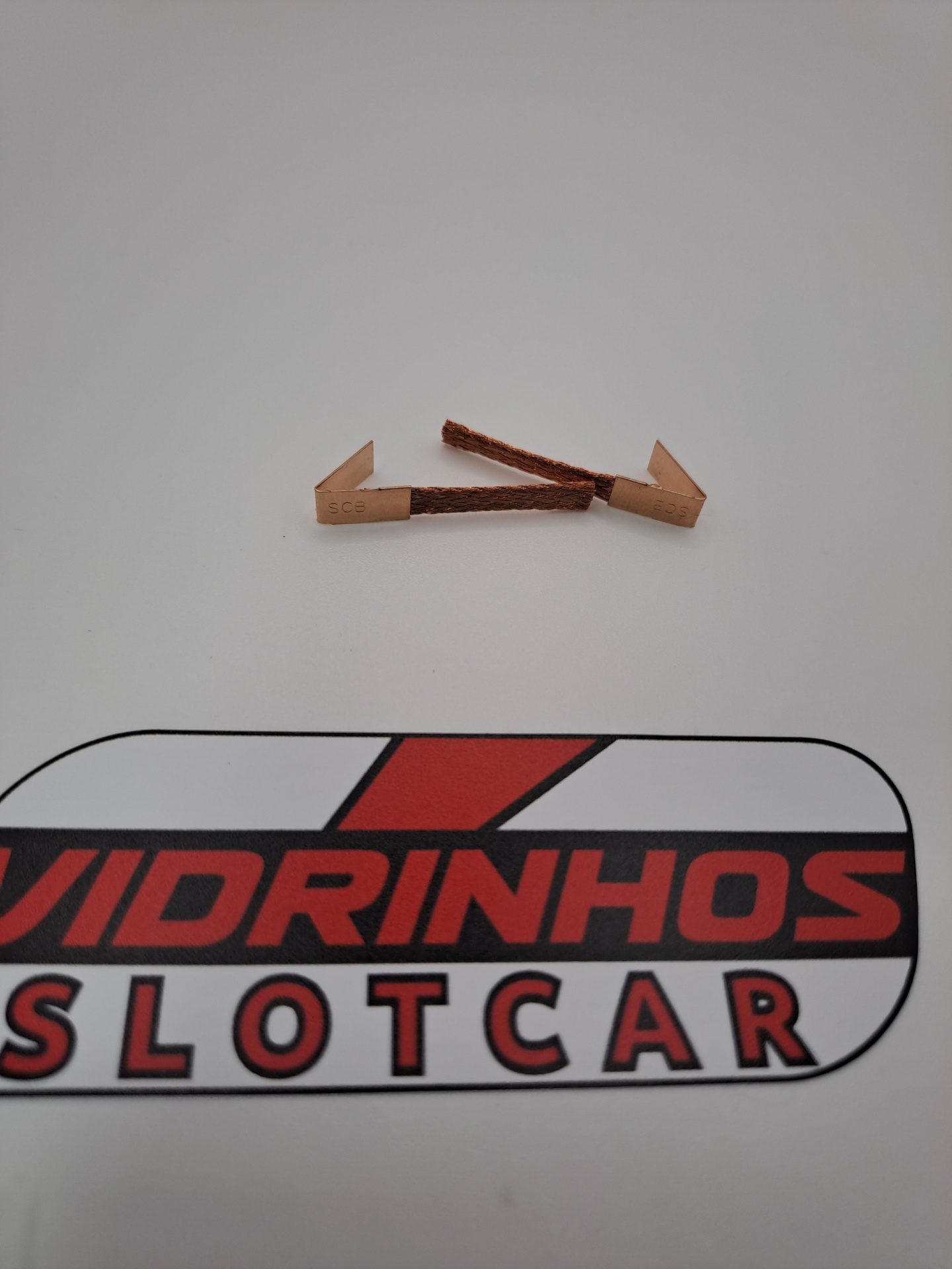 Componentes pequenos castanhos com extremidades beige angular sobre logotipo VIDRINHOS SLOTCAR