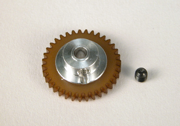 Engrenagem de plástico castanho com centro metálico prateado e um parafuso preto em fundo branco.