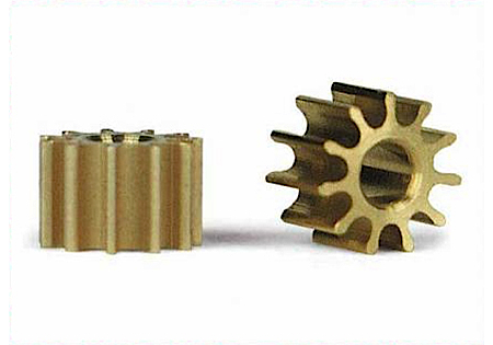Duas engrenagens castanhas com orifício central em fundo branco.