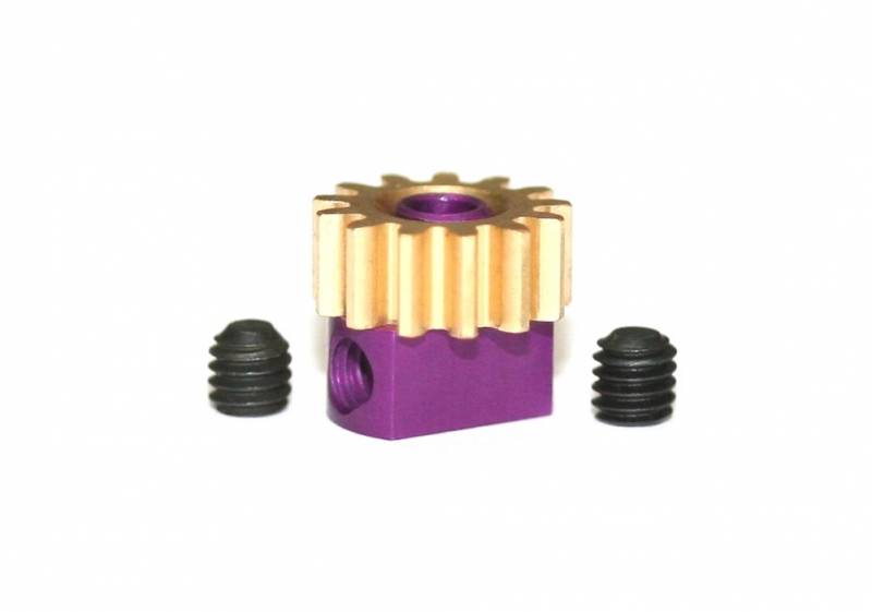 Peça mecânica com engrenagem bege e bloco roxo, com dois parafusos pretos ao lado.